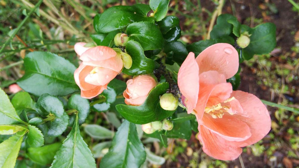 季節外れのボケの花が咲きました❇️サーモンピンク色コロンと可愛い(´ ▽`).。o♪♪ ボケ