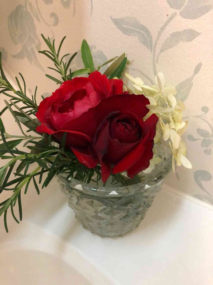 お庭の薔薇オリーブローズマリーでアレンジを脱衣所に💕