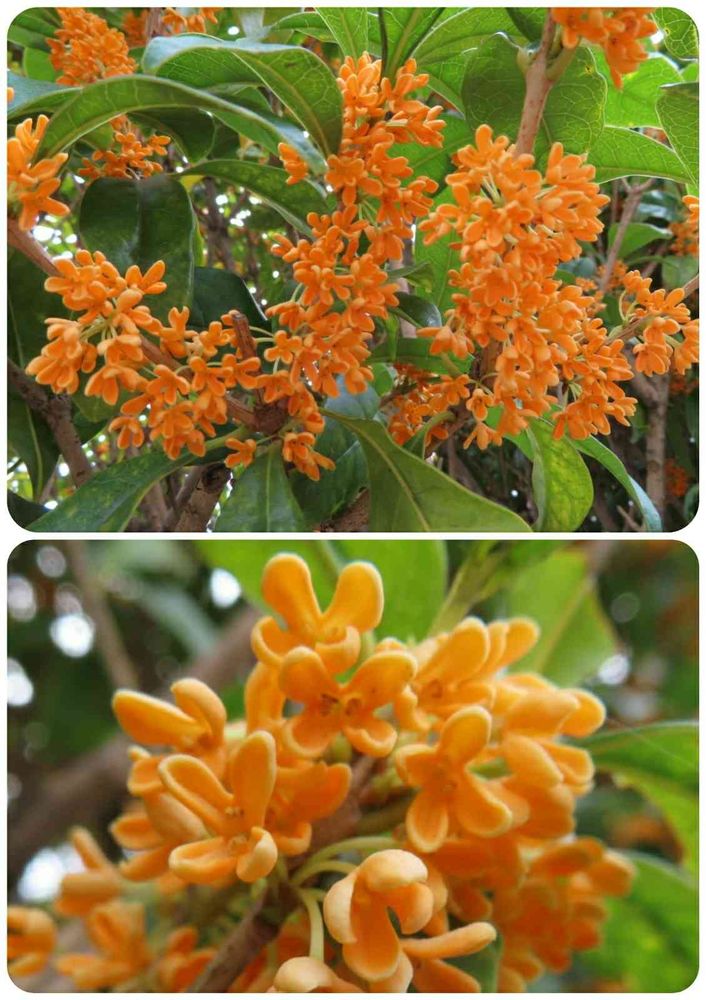 キンモクセイ(金木犀)はモクセイ科モクセイ属の常緑小高木樹で、モクセイ(ギンモクセイ)の変種。和名の由来は、樹皮がサイ(犀)の足に似ているため中国で「木犀」と名付けられ、ギンモクセイの白い花色に対して橙黄色の花を金色に見立てキンモクセイと言う。花期は秋(9~10月)で、葉腋に小さいオレンジ色の花を無数に咲かせる。雌雄異株で雄株の方が花数が多い。花数はギンモクセイよりも多く、ギンモクセイよりも濃厚で甘い芳香を放つ。