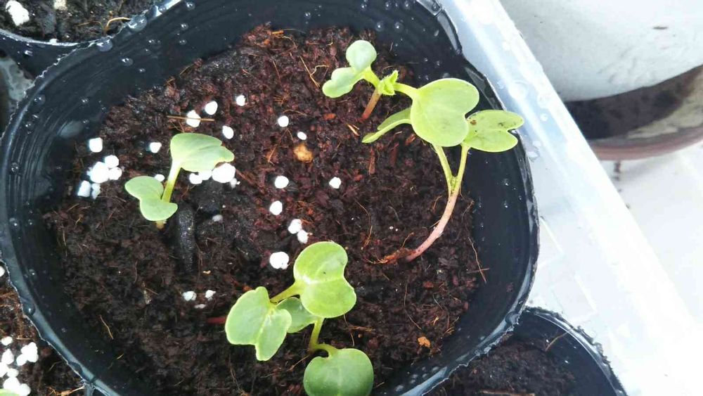 二十日大根、ポットに植え替えました。根本が赤くなってます