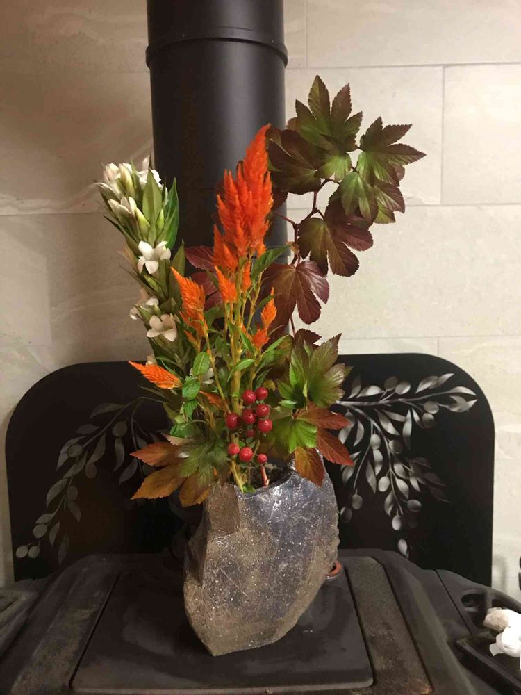急に寒くなったので、晩秋のイメージでいけました。薪ストーブが花台として使えるのもあと僅かです。
