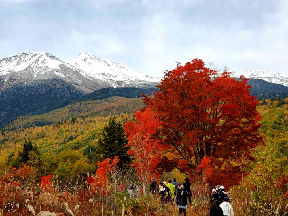 真っ白い山並みの手前に、真っ赤な大カエデの紅葉🍂✨