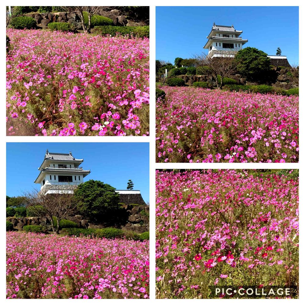 すごくきれいなコスモス畑ですねまたとっても広いんですね、お城とコスモス素敵に撮れていますね