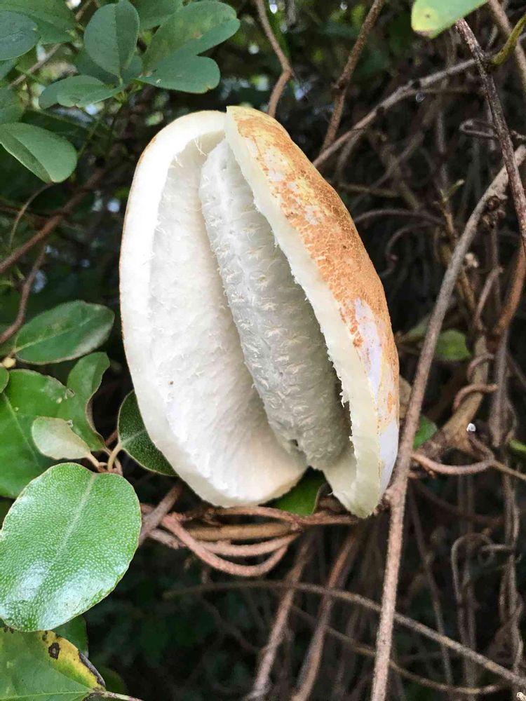 ムベはもう少し丸くてこのように二つに口を割ることは無いように思います。それから熟したムベは多少赤みがかってきますね。