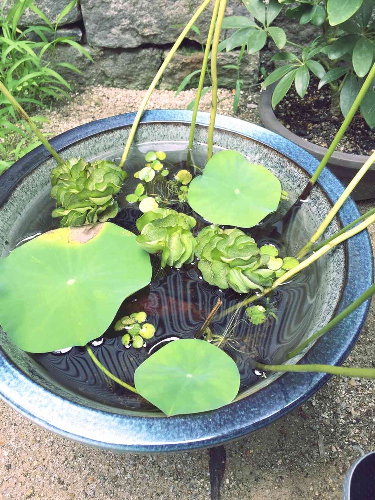 ボウフラ対策でアオメダカ5匹が仲間入り。鉢の中でのミニ生態サイクルに期待。蚊モマケズに頑張れ。