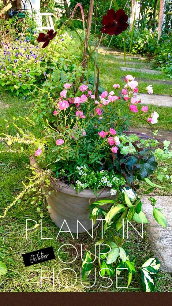ミニ薔薇🌹の寄せ植えステキです😌💓チョコレートコスモスがしまってみえてる❤️お庭にあってますね❤️⤴️⤴️🎵