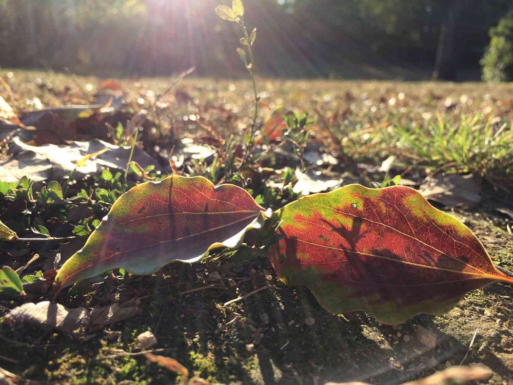 木から落ちた葉が太陽からスポットをあててもらって輝やいていました。紅葉した枯葉は落ち葉となってからは、次はこの場所が舞台!と そこにいるようです✨