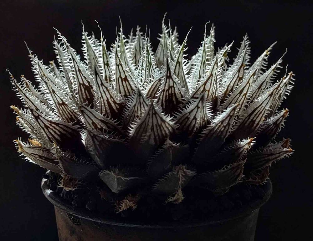 日射しにしっかり晒すと葉脈が黒っぽくなり白く濁ったすりガラス風の窓と相まってモノトーン調が綺麗な品種です