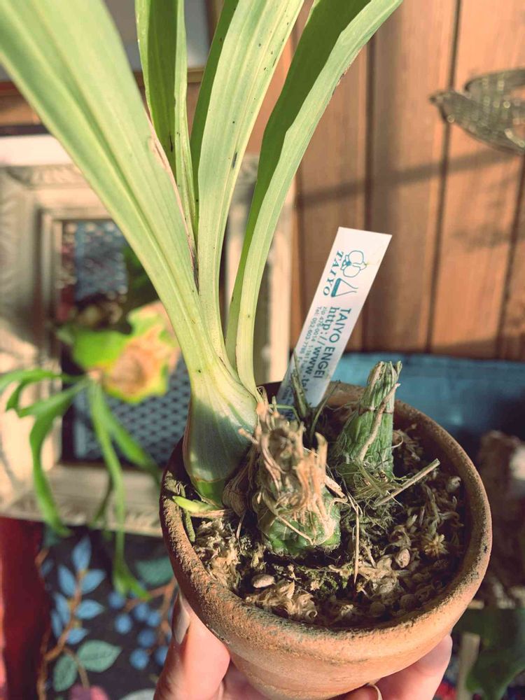 ほかの方の株を見ると、鉢がバルブで埋め尽くされるほどパンパンになっていて、比べるとウチのコはまだスペースがあるのかな?とも思います。でも、バルブの展開が鉢の片方に寄ってるだけかも。