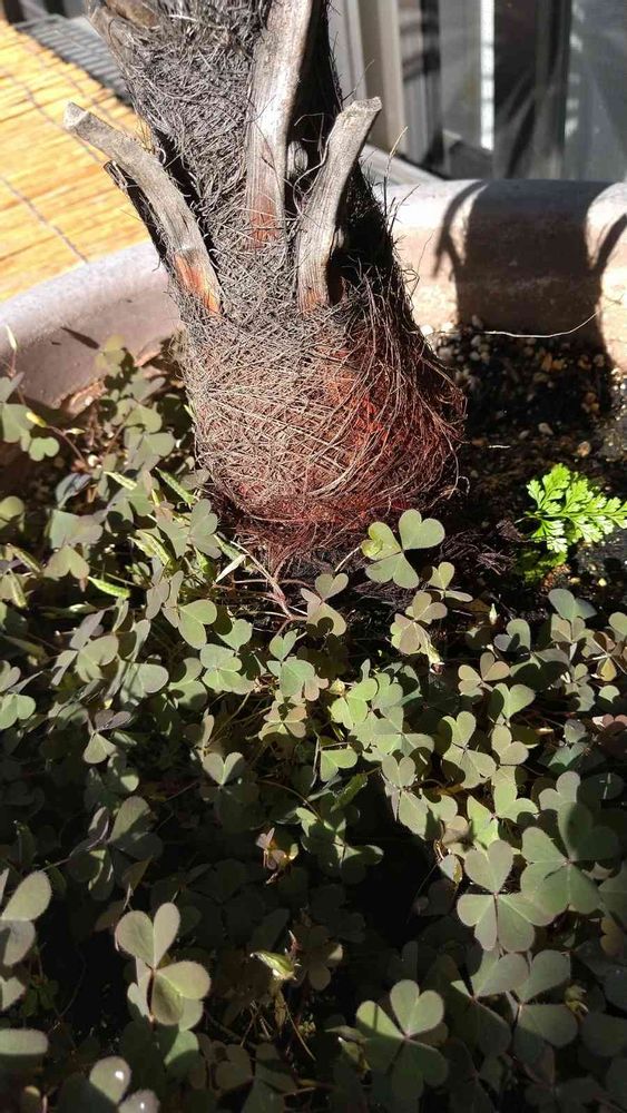 ベランダのシュロの根本にいつの間にかカタバミの種類が生えてきました。