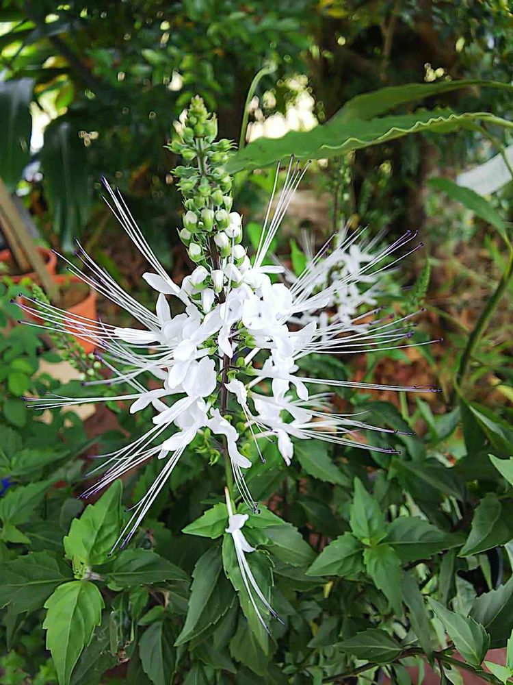 クミスクチンとは東南アジアの言語で「猫の髭」という意味。 ピンと伸びたおしべとめしべが猫の髭を連想させることから名づけられました。 和名も直訳の「ネコノヒゲ」。 成長すると1メートルほどになるクミスクチンはシソ科の多年草で、 6月から11月にかけて白や薄紫の可憐な花を咲かせます。