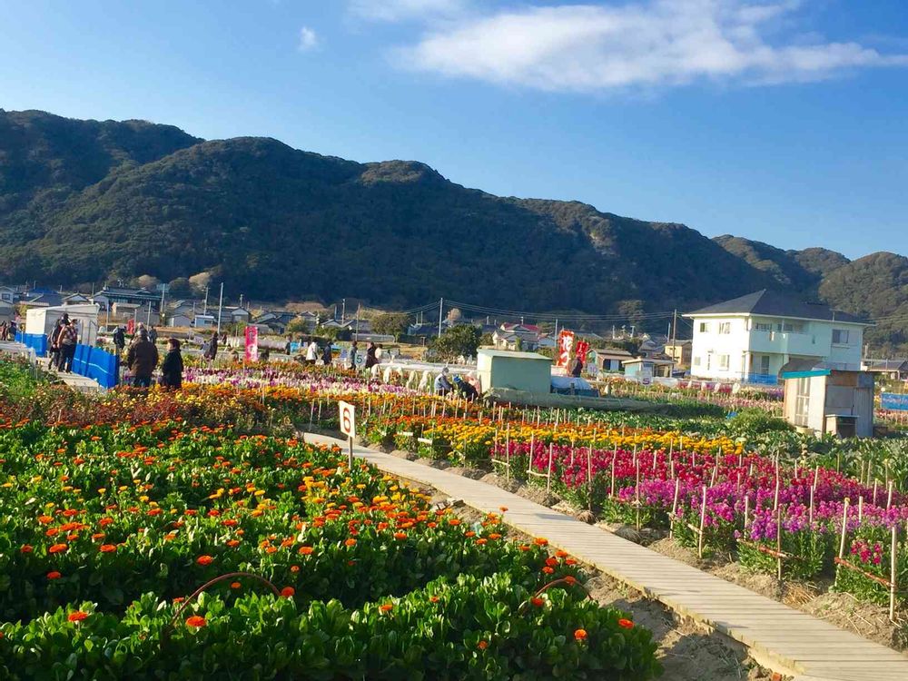お花畑があるあたりは温暖な気候みたいです。河津桜も咲いてました。ハイビスカスも冬に枯れることがないらしく、ハイビスカスの垣根があるお宅もありました。同じ千葉でもうちの辺りはまだ寒いです…