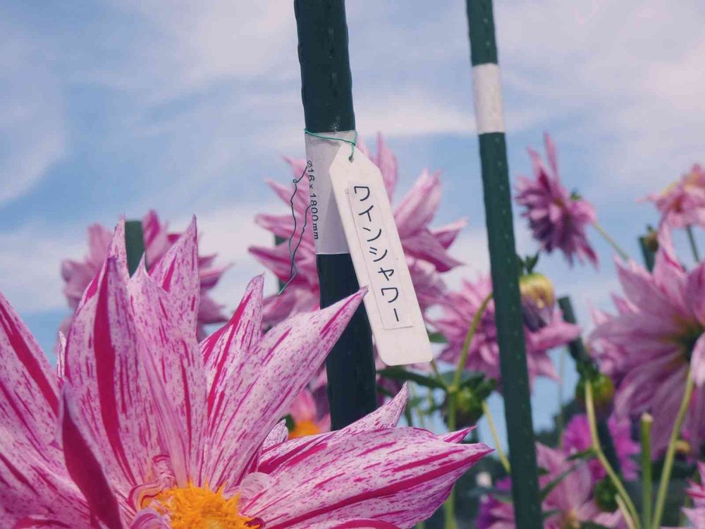 ひとつひとつのダリアに、ポールがあり名前が付いている。この花💠は、カタカナ名だか、「花嫁人形」などネーミングが面白いものもある。