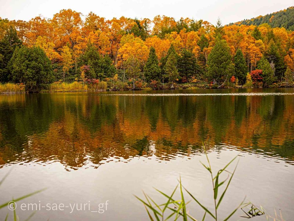 2020年10月14日の志賀高原 木戸池 水面が鏡のように風景を映し出しています。