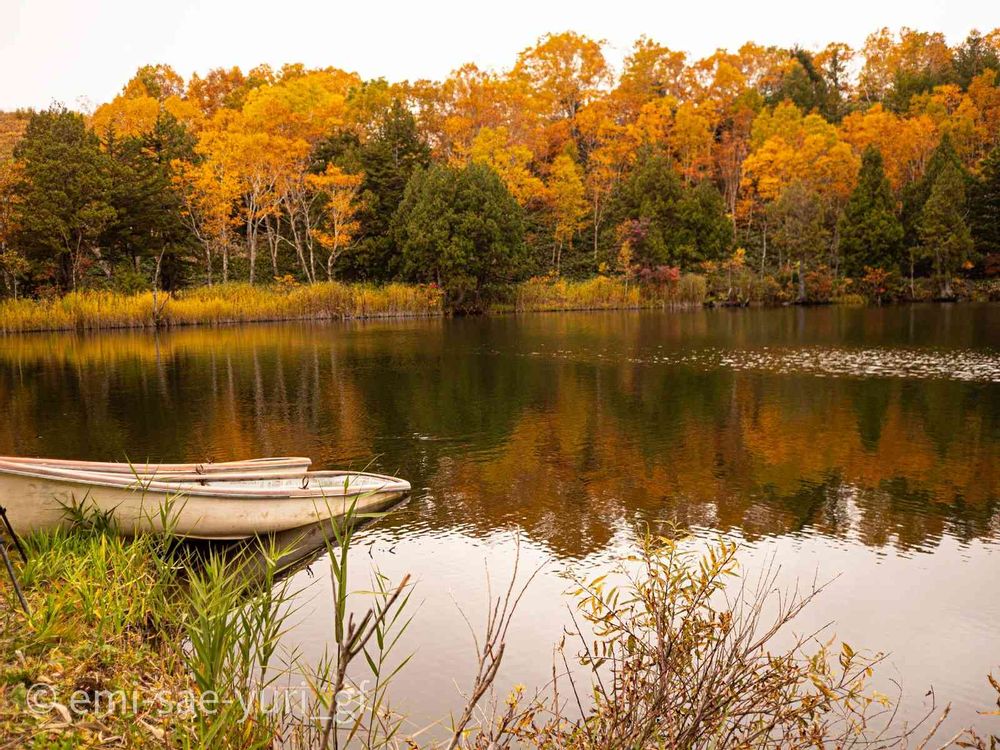 2020年10月14日の志賀高原 木戸池 水面が鏡のように風景を映し出しています。