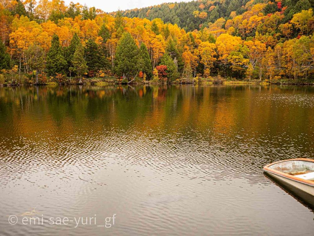 2020年10月14日の志賀高原 木戸池 水面が鏡のように風景を映し出しています。