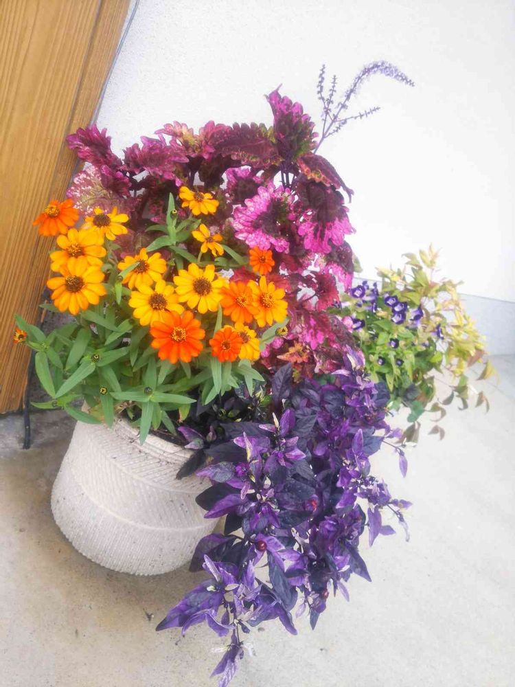 すごくカラフルで元気いっぱいの寄せ植えですね☺️