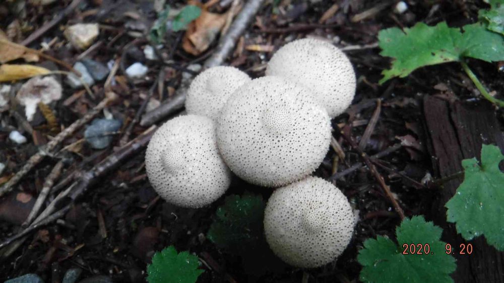 この写真のはまだ若くて上部中央に穴が空いていませんが、茶色になったのには空いていると思います。キノコの表面に雨粒が当たったり、突いたりして刺激を与えるとその穴から煙のような物が出ます。その正体は胞子です。特に有毒ではないので指先や、小枝でツンツンして確認しても大丈夫です。