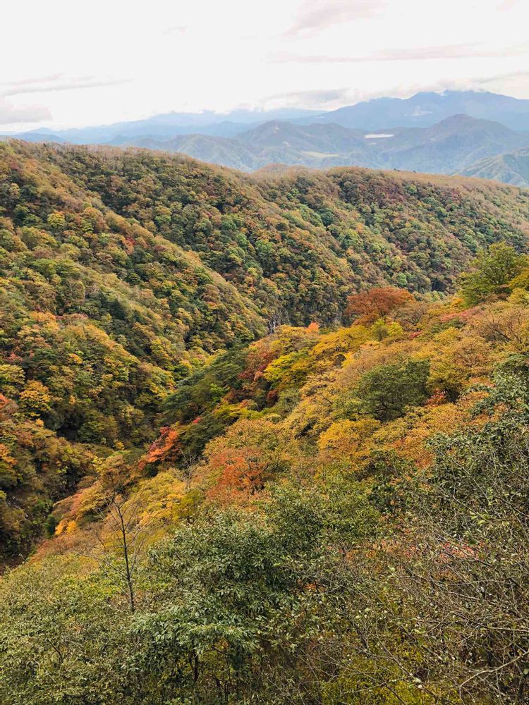 霧降高原キスゲ平を過ぎ、以前は、自殺の名所と呼ばれ、橋に柵が設けられた、標高1433mにある「六方沢」附近から見た、稜線の紅葉🍁🍁🍁‼️