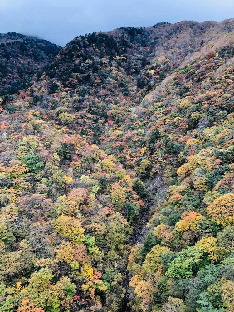 霧降高原キスゲ平を過ぎ、以前は、自殺の名所と呼ばれ、橋に柵が設けられた、標高1433mにある「六方沢」附近から見た、稜線の紅葉🍁🍁🍁‼️