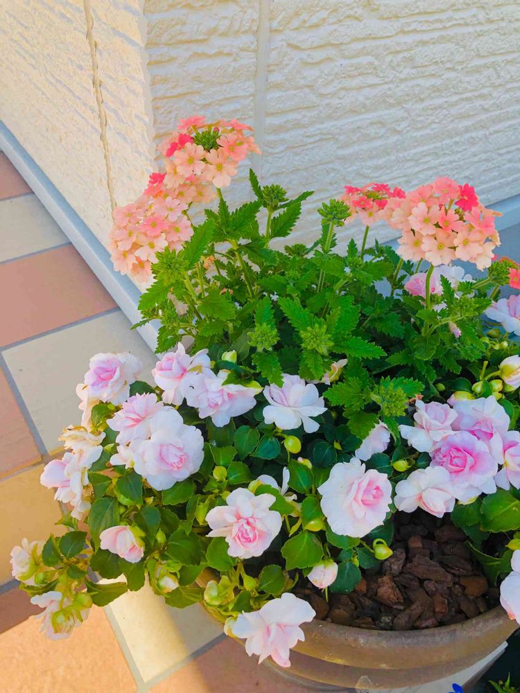 バーベナピーチメルバと八重咲きインパチェンス寄せ植え 2年前の寄せ植え
