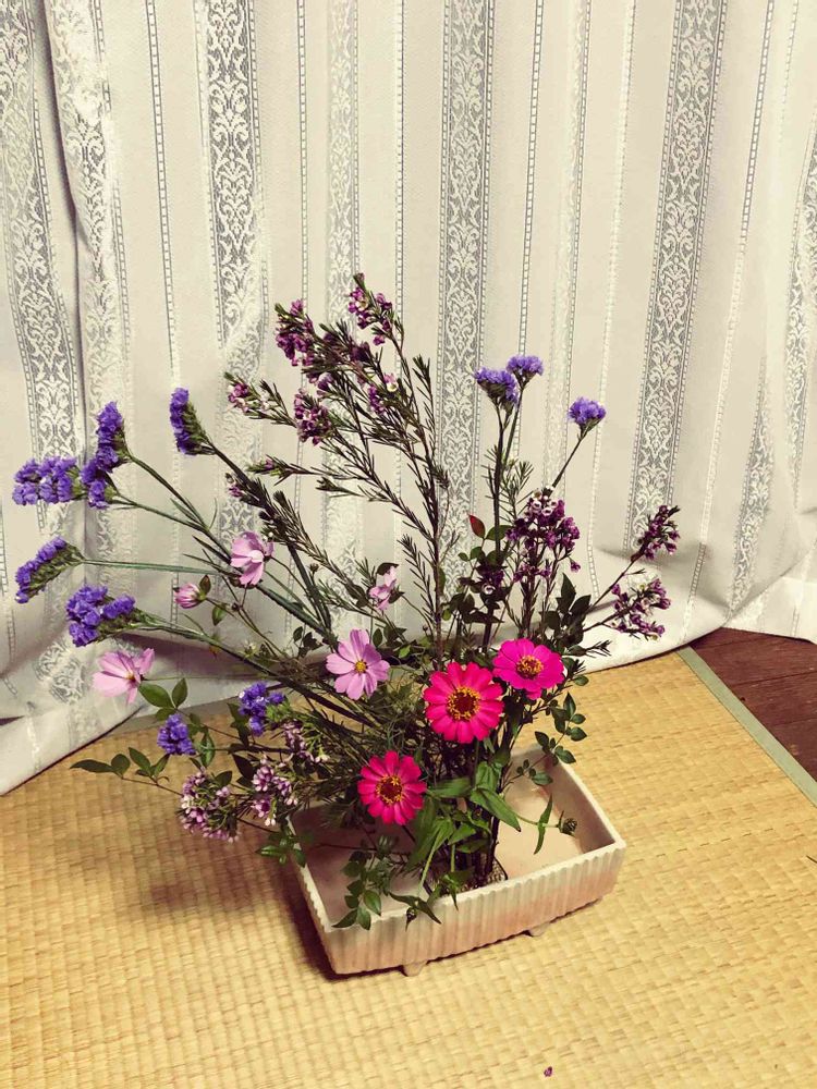 スターチス、ジニア、ワックスフラワー、コスモスで生け花やりました(*^ω^*)