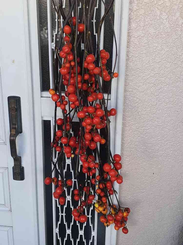 我が家の玄関にミニトマトが枝ごと鈴なりだ⁉️
