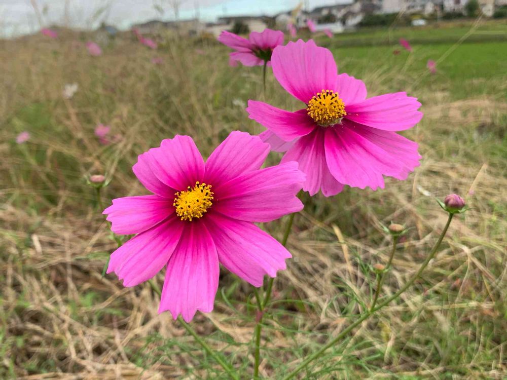 秋桜コスモス、宇宙なんて大きな名前を戴いてるけど、物悲しさと華やかさを兼ね備えている花🌸今日のランニングコースに咲いていたものです。周りは刈り取られた稲が雑草と一緒になって殺伐としているのに、この空間だけ火が灯ったように見えます😃