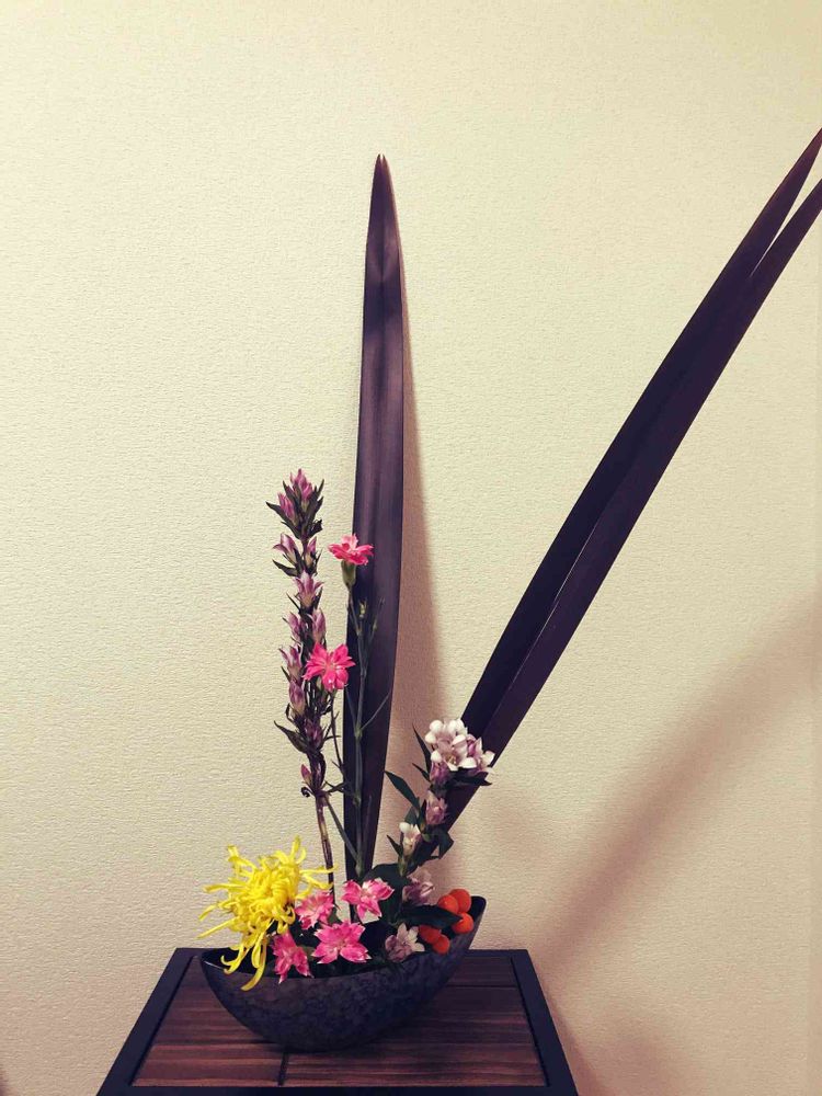 久々のお教室。ニューサイランの黒が格好良かったので強めのピンクとコントラストに。リンドウのくすみ紫と相まって渋めな感じに。