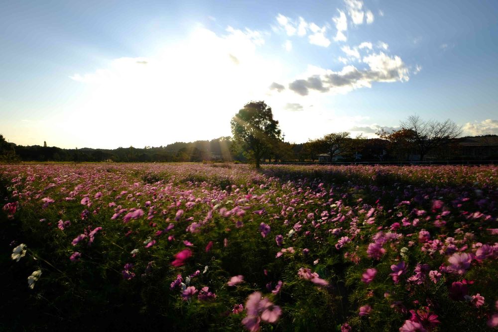 コスモス畑の真ん中の木は人気があります。インスタ映えかな🤔