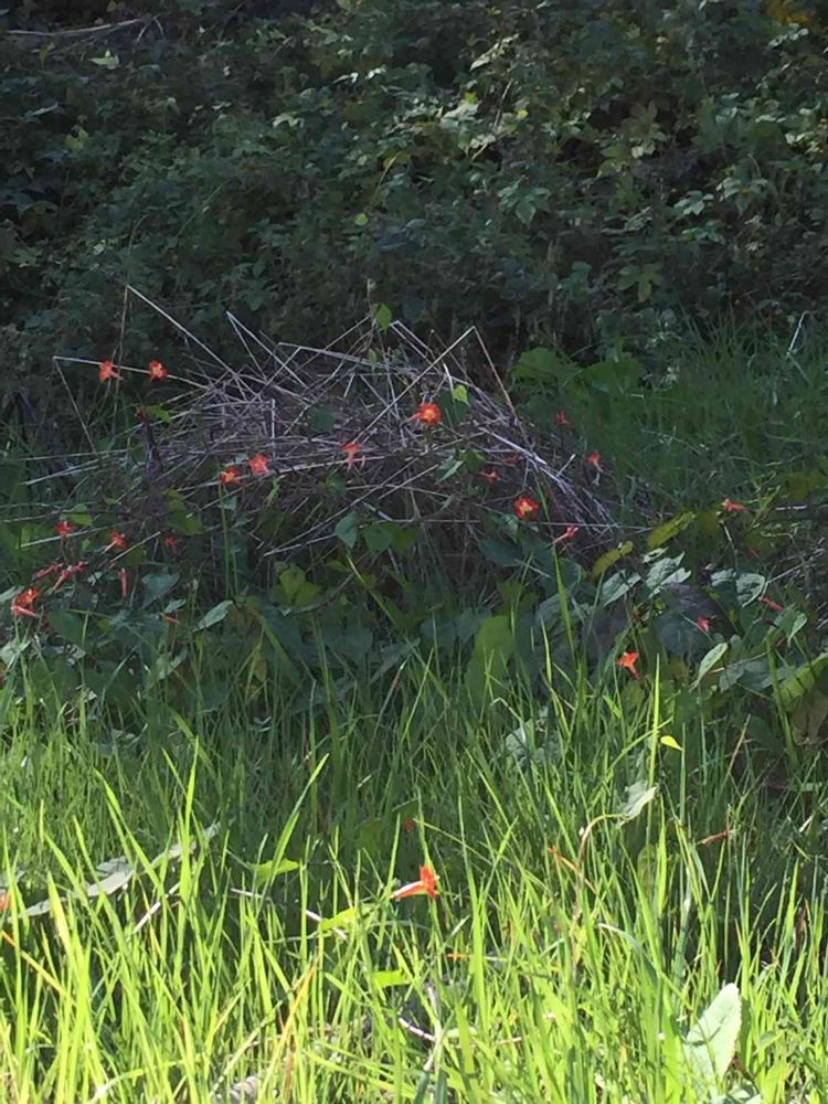 草の中に 赤い小さい アサガオみたいな形をした花🌸