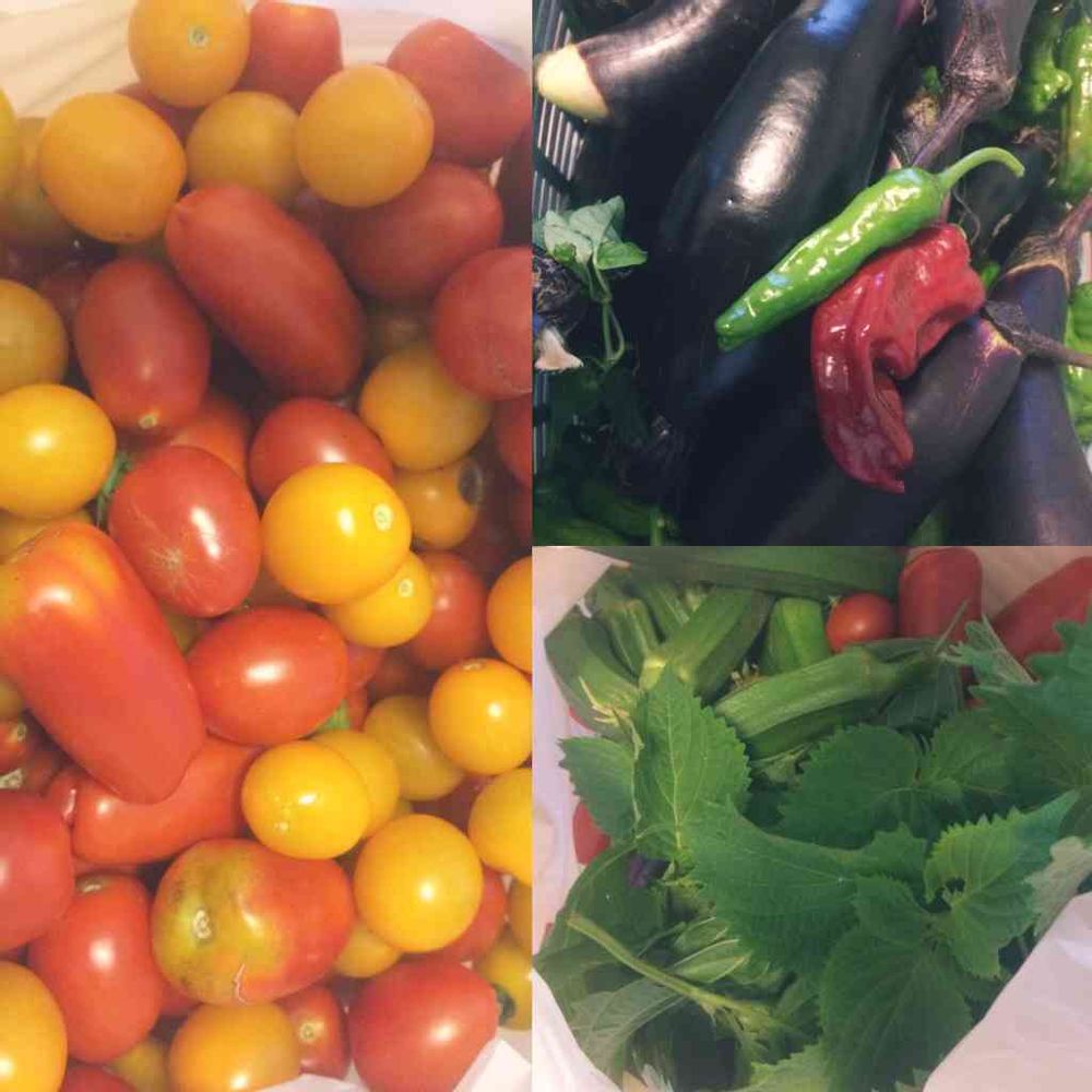 昨日の収穫物。トマト各種、ナス、シシトウ、ピーマン、シソ、オクラ。