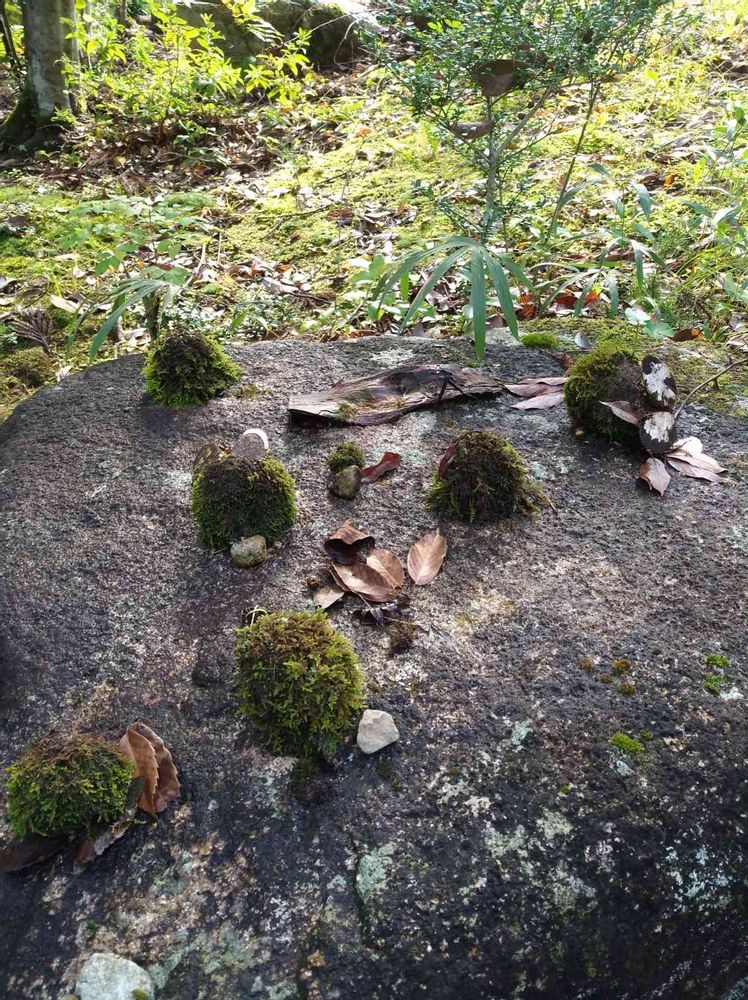 楽しい苔のオブジェですね。わたしは今森の中のベンチでお昼コロッケ食べながらドングリ沢山拾ってるよ🎵