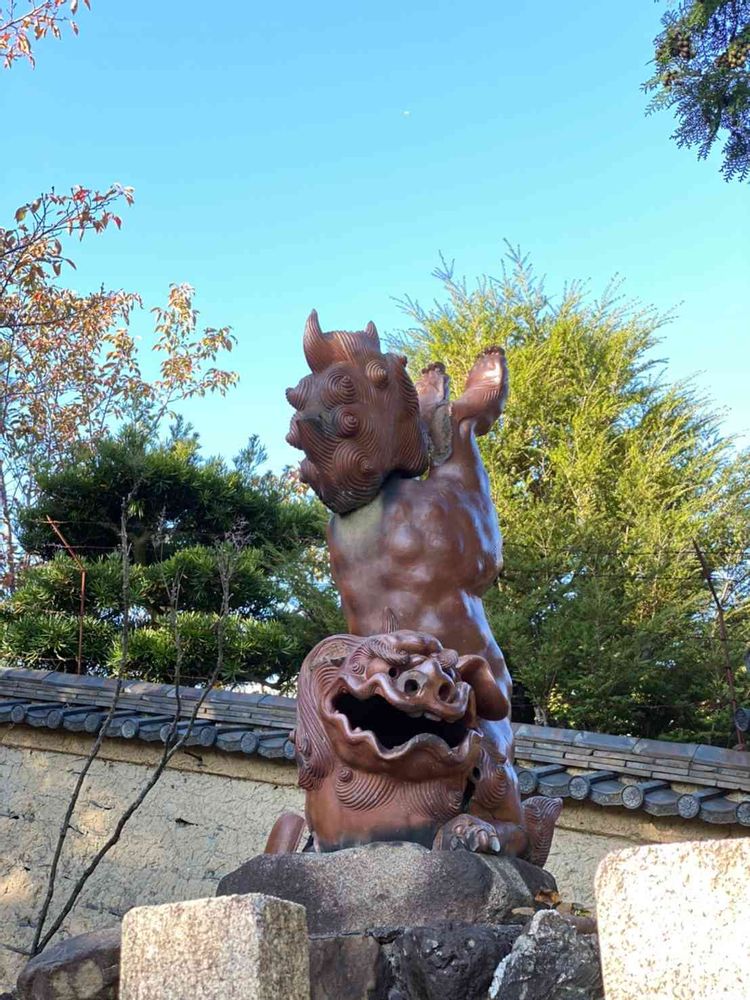 備前焼の逆立ちの狛犬が、青空をバッグにお出迎えしてくれるそうです。