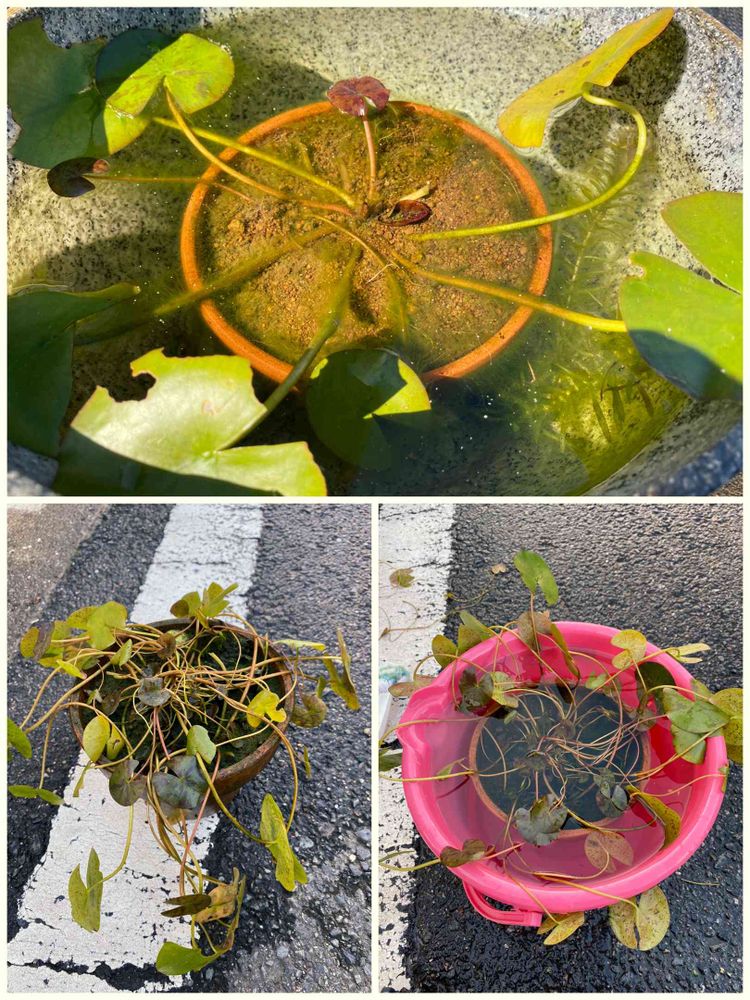 2020.10.25 1つが藻の大量発生、1つが水の汚れが目立ったのでお掃除。水中の藻取りは楽ですが茎や葉に付いた藻取りはとても大変です。メダカがいてるので絡まらないように手入れは欠かせません。