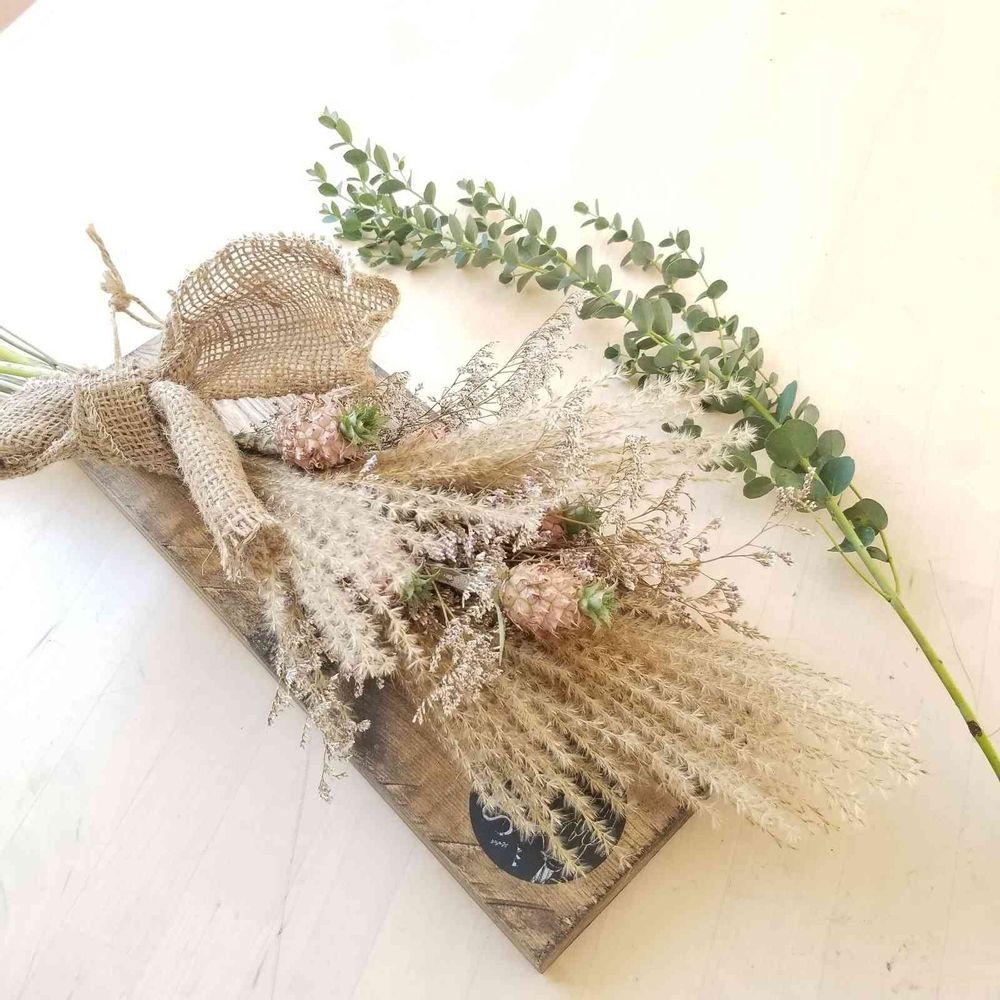ミニパインとススキを一緒に束ね手作り板に固定♪