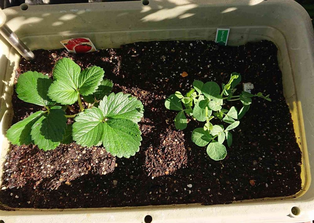 こちらのプランターには苺の苗とグリンピースの苗を仲良く植えてみました。