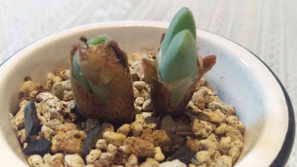 茶色くなってきたコノフィツムを、死亡フラグなのかどうなのかよくわからないので、試しにお水をあげたら、中から緑の元気そうな子が😆