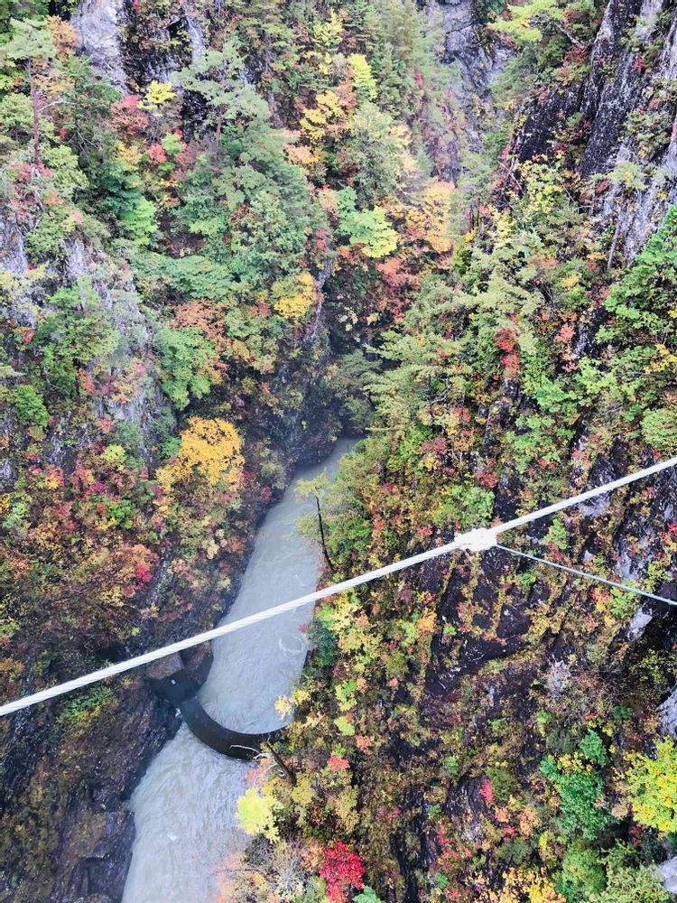 川俣ダム正面にある「瀬戸合峡 わたらっしゃい吊り橋」から、ダム下の峡谷に広がる、紅葉🍁🍁🍁の様子‼️