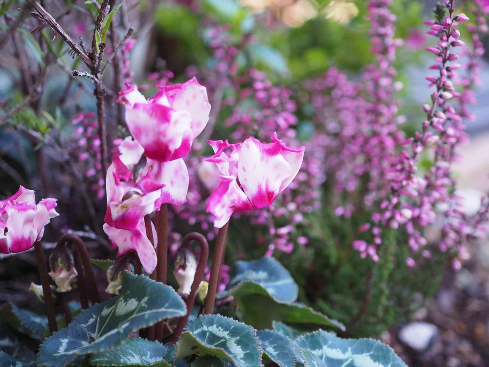 アプローチに植えた、ガーデンシクラメンとカルーナガーデンガールズのお花が綺麗です💕