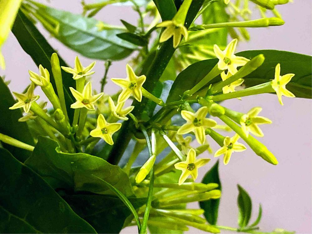 夜の間だけ、小さな星形の花が咲き、青リンゴ🍏に似た香りを漂わせます。別名、ナイトジャスミンと呼ばれているそうです。