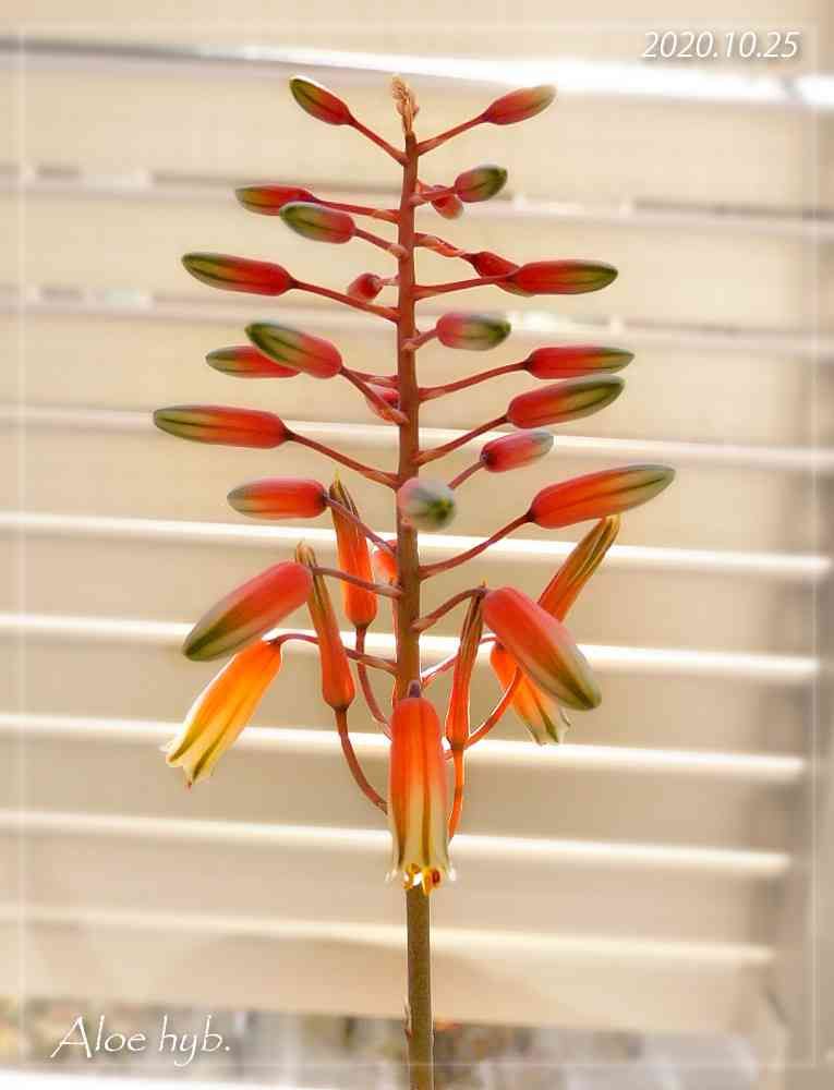 もうちょっと咲いたよ、アロエ交配種。んー、下から順番に咲いて、つぼみの時は横、咲いてるときは下向き、咲いた後は上向き?
