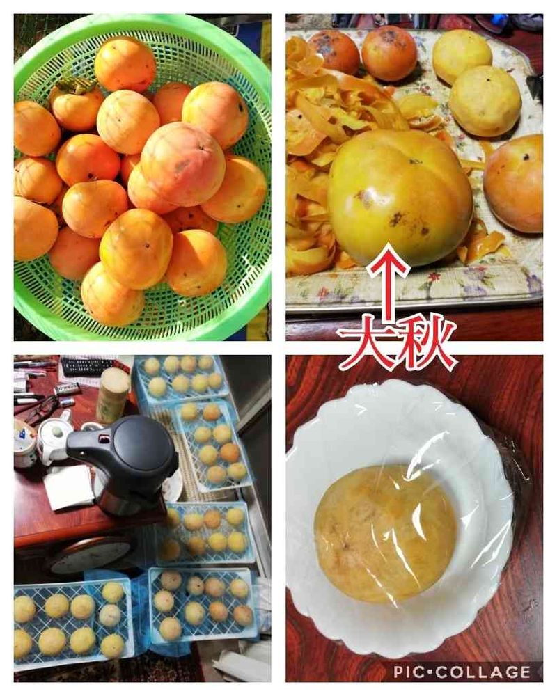 あまり 甘くない柿 干し柿にすれば 甘くなると思って 干し柿用に 皮をむきました 矢印は 今が人気の大秋 ビッグサイズです♪ 水分を抜けば 干し柿になるので レンジで チンしてみようと思います 甘味を 出すには天日が 良いと思いますが🤭