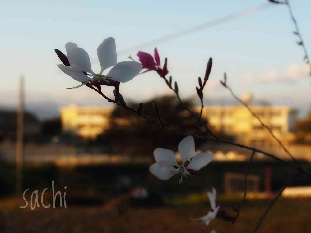 夕日を受ける小学校の校舎をバックに「ガウラ」✨✨✨