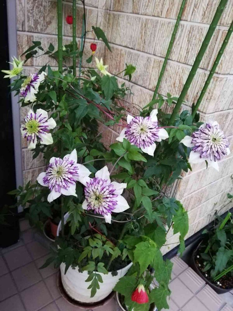 クレマチス、ビエネッタ。他の鉢植えの冬越し移動のメドもつき…、花を咲かせているこの鉢植え抱えウロウロ🤭👣➿