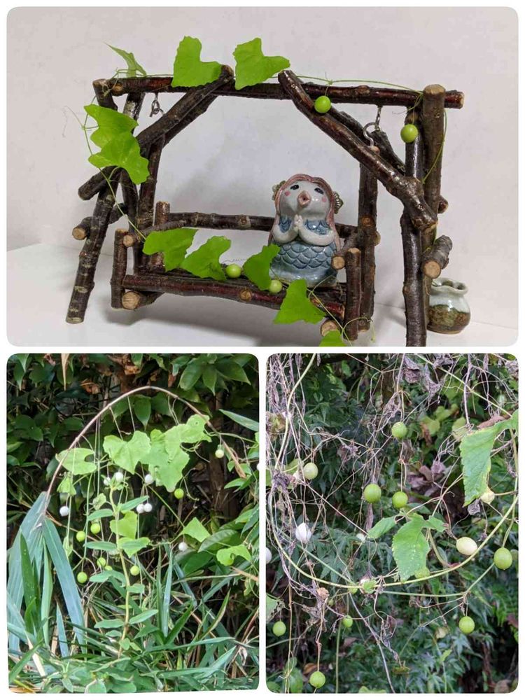 先日ハンドメイド作品の展示会で買った桜の木の枝のブランコにスズメウリを絡ませてみました🎶
