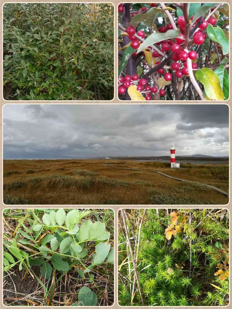 灯台に繋がる遊歩道の両サイドに高さ20~30cm程のハマナス。茶色く広がっているのがハマナスで、緑に見えるのがアキグミの木です。