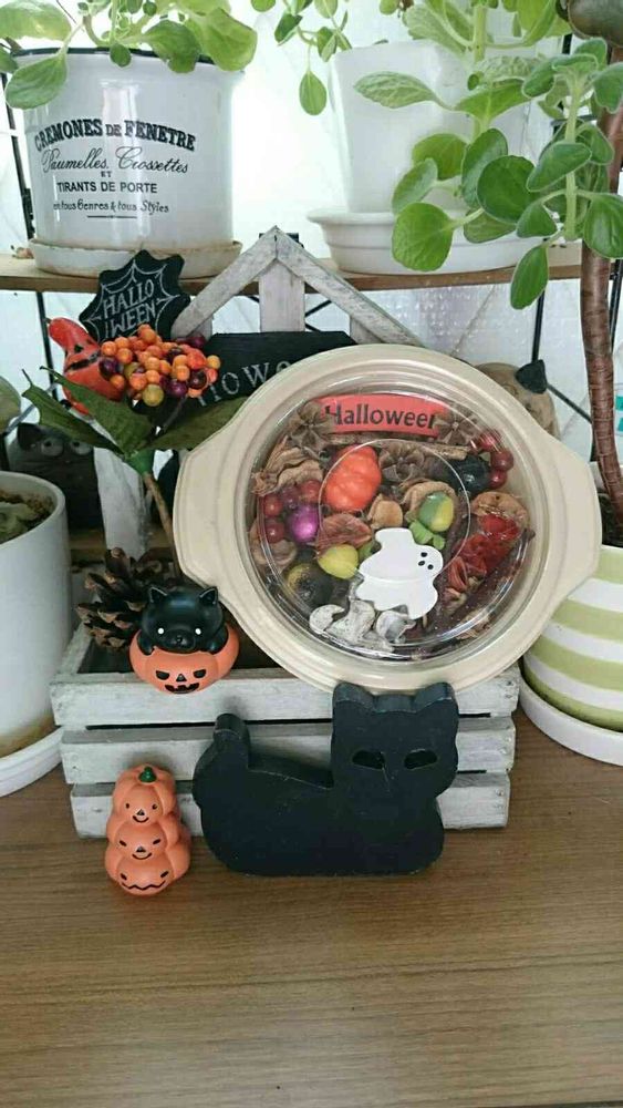 カレー🍛が入っていた容器が可愛く見えて、ポプリや木の実を入れて🎃BOXにしました‼