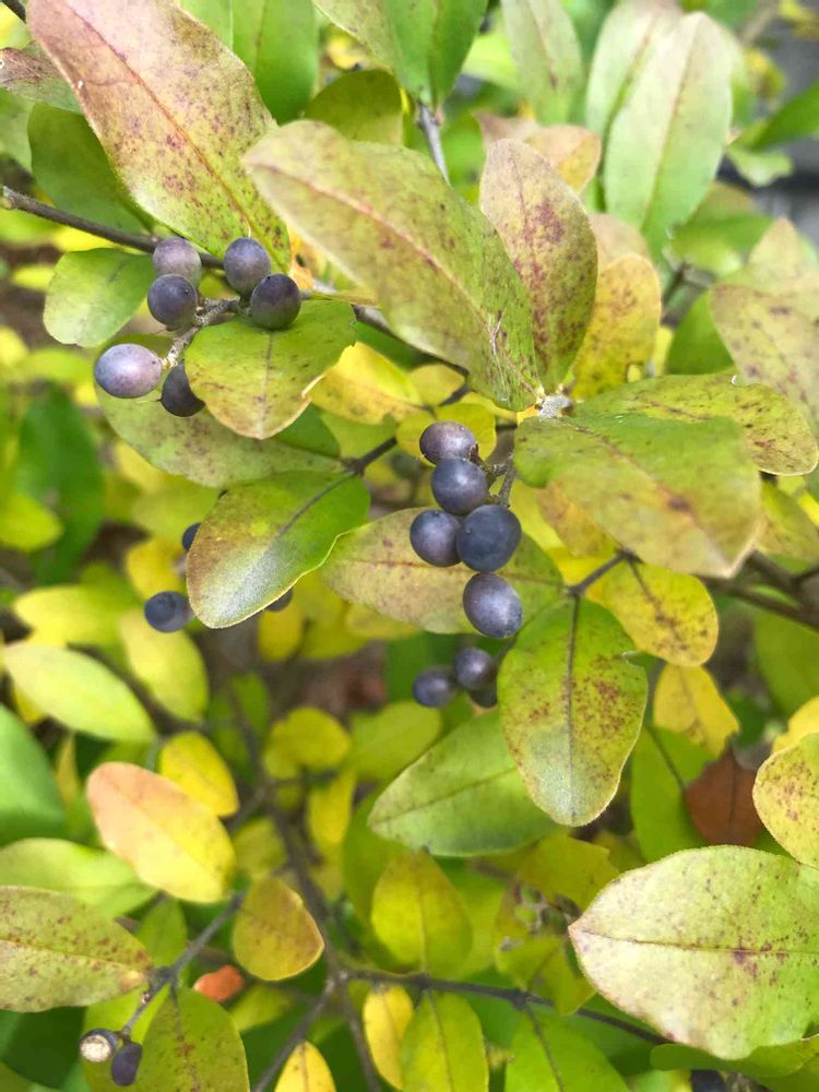 葉が対生、モクセイ科の白い花、同科のネズミモチと同じ、小さな黒い実のイボタです。