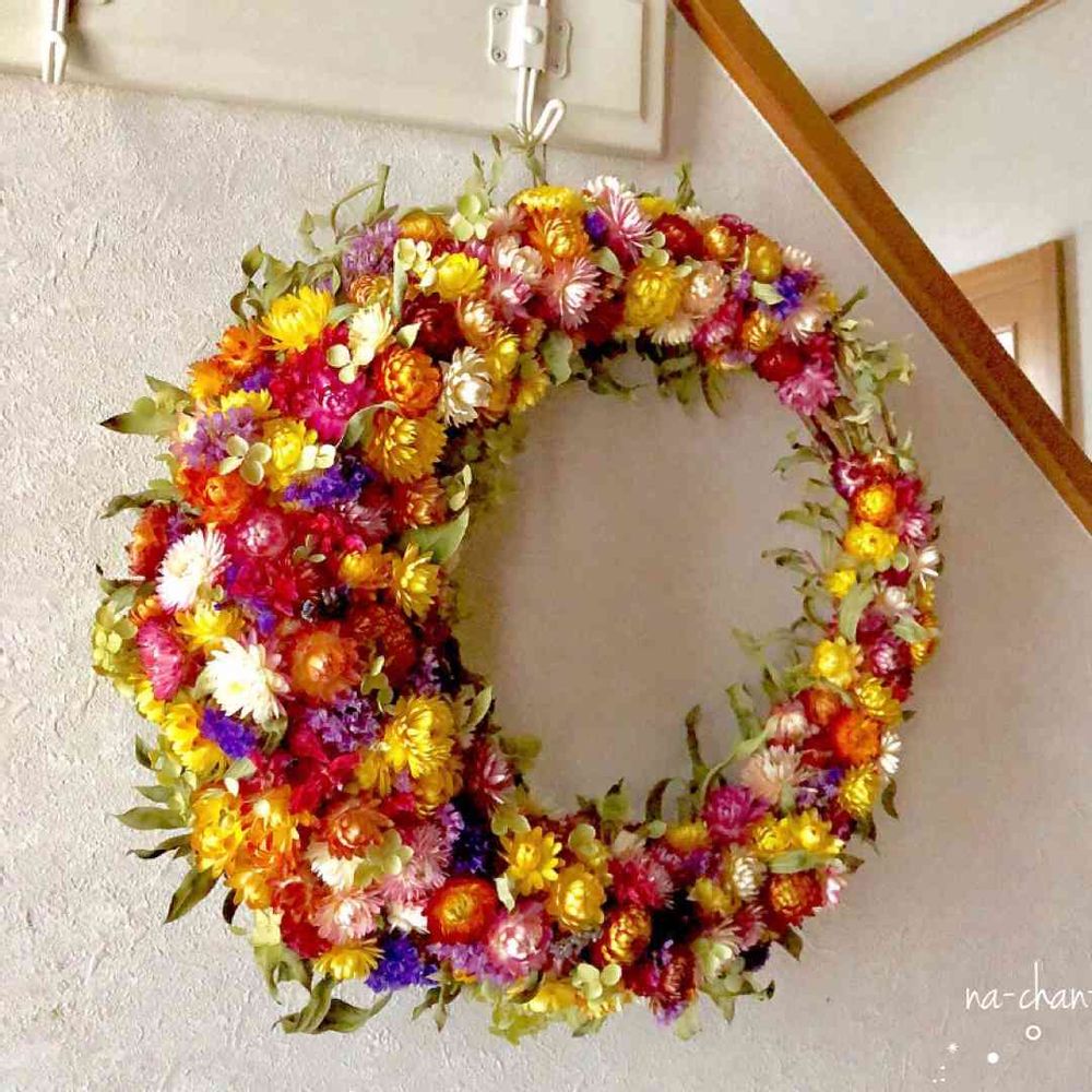 初めまして!元気の出る素敵なリースですね✨ムギワラギクというお花なんですね🌼